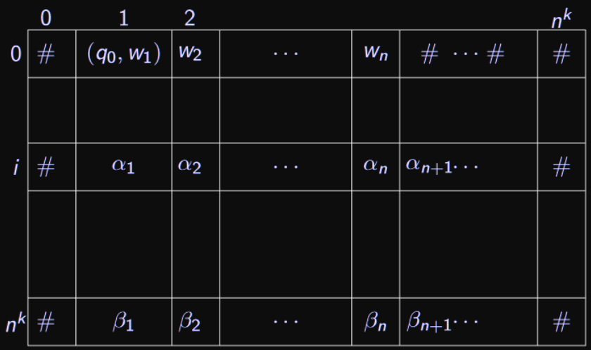 - musí zajistit, že na posledním řádku tabulky se vyskytuje stav . (Předpokládáme, že pokud TS skončí výpočet dřív než po krocích, všechny následující konfigurace (řádky tabulky) jsou stejné)