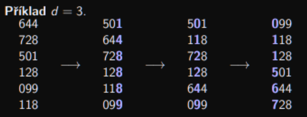 - V průchodu se čísla setřídí podle jejich poslední číslice,