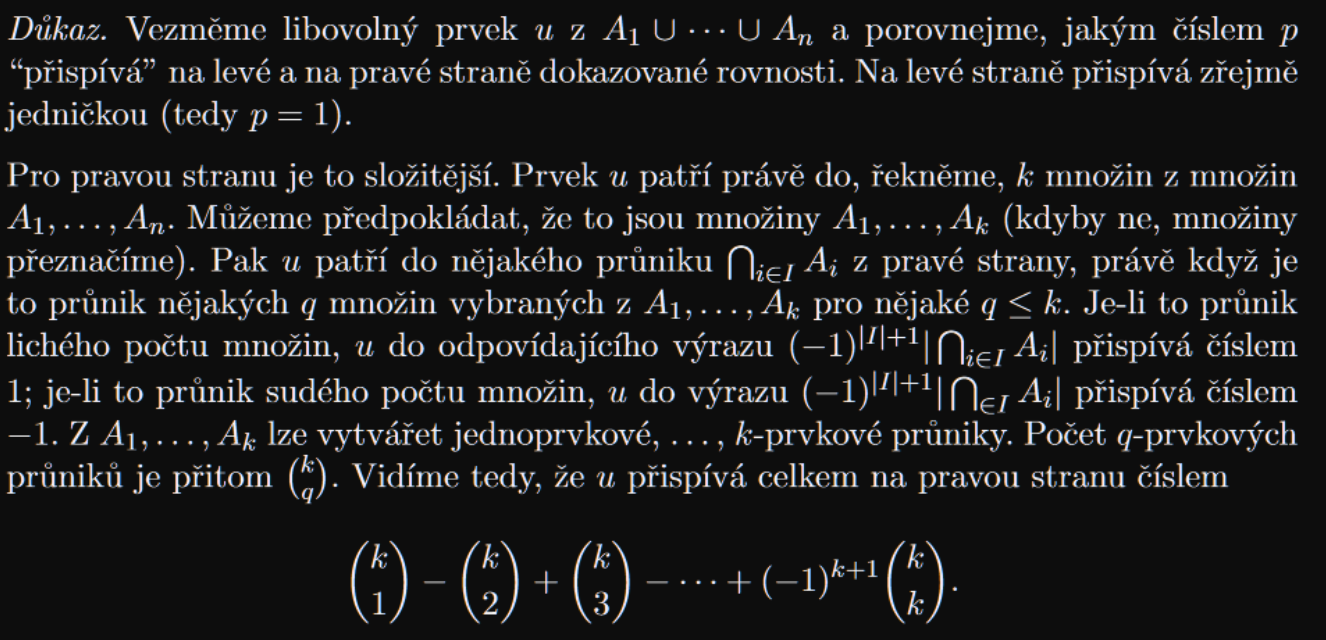 - Tedy v součtu na pravé straně jsou počty prvků všech možných průniků (jednočlenných, dvoučlenných, …, až po -členné) utvořené z , přitom počet prvků daného průniku je se znaménkem pro průniky lichého počtu množin a se znaménkem pro průniky sudého počtu množin.
