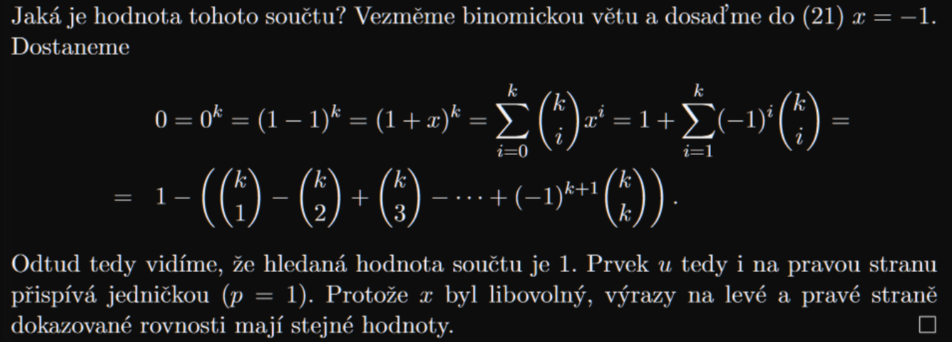 - např. pro je to . Výraz je roven , pokud obsahuje lichý počet prvků, a je roven , pokud obsahuje sudý počet prvků.