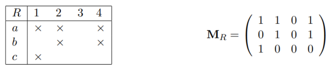- Máme relaci , kde a . Relaci R repzentujeme maticí/tabulkou, ve které se na místě odpovídající řádku a sloupci nachází hodnota, která určuje, zda dvojici , nebo