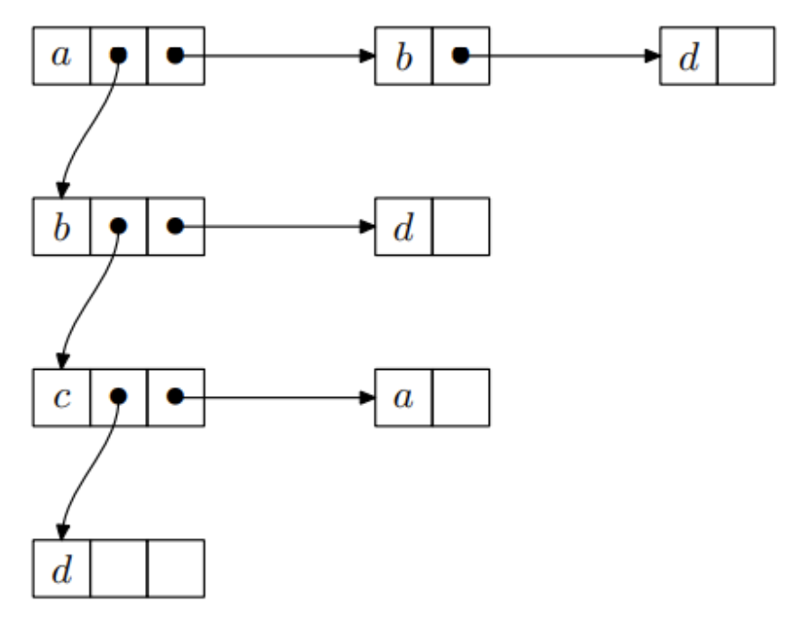 - Z každého prvku hlavního seznamu vede seznam obsahující právě ty , pro každé
