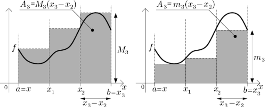 To znamená, že množina horních součtů je zdola omezená a existuje největší dolní mez těchto součtů. Číslo budeme nazývat horní Riemannův integrál funkce .