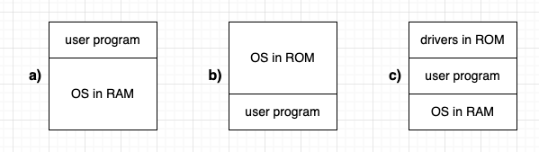 • časté řešení: OS a ovladače zařízení na začátku nebo na konci, program ve zbylé části