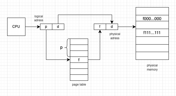 • číslo stránky se vezme jako index do stránkovací tabulky a nahradí se tam uložených číslem rámce f
