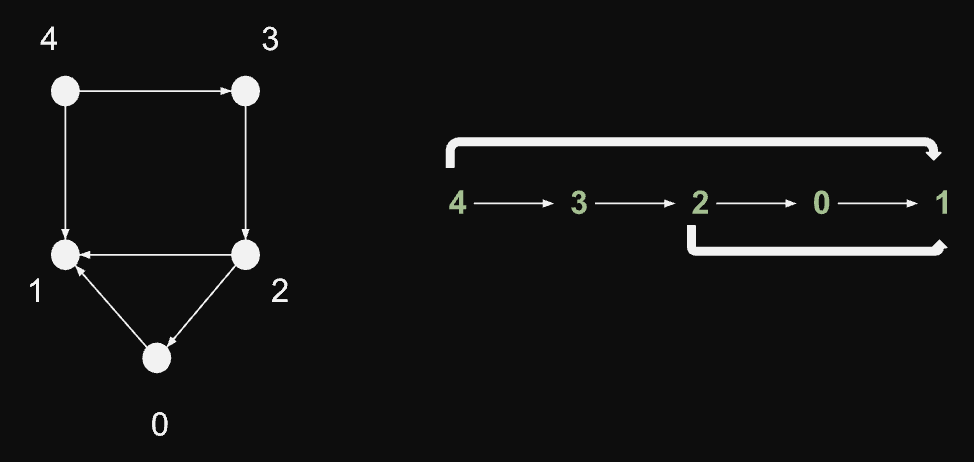 Po skončení průchodu obsahuje seznam uzly uspořádané sestupně podle hodnot položky .